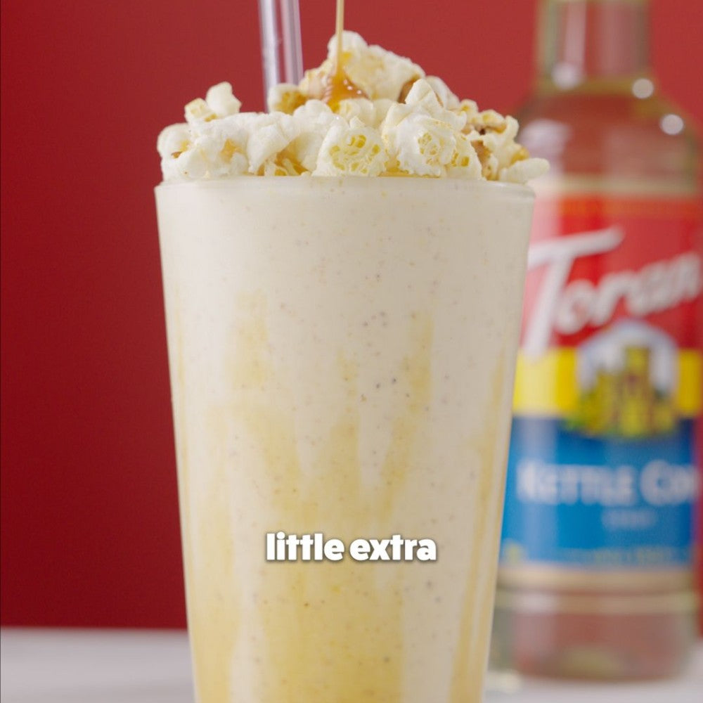 Add vanilla ice cream, kettle corn popcorn, milk, Torani Puremade Caramel Sauce, and Torani Kettle Corn Syrup to a blender and blend. Grab a glass and line the inside with Torani Puremade Caramel Sauce. Fill the glass with blended milkshake, garnish with kettle corn, top off with caramel sauce, and enjoy!