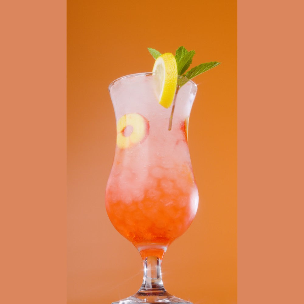 Garnish: Sour peach rings, mint sprig, lemon wedge