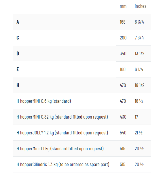 Optional hoppers measures: 320 g hopper | 1 kg hopper