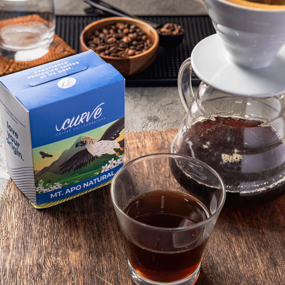 A cup of our natural-processed Mt. Apo beans lets you taste hints of floral, dates, and blueberries. Delicately grown and cultivated in Davao del Sur at an altitude of 1450 masl, this rich-tasting and aromatic coffee deserves the soaring high recognition as the highest mountain where it thrives.